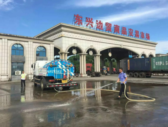 ▲對(duì)國(guó)門口岸旅游熱點(diǎn)景點(diǎn)進(jìn)行沖洗作業(yè)