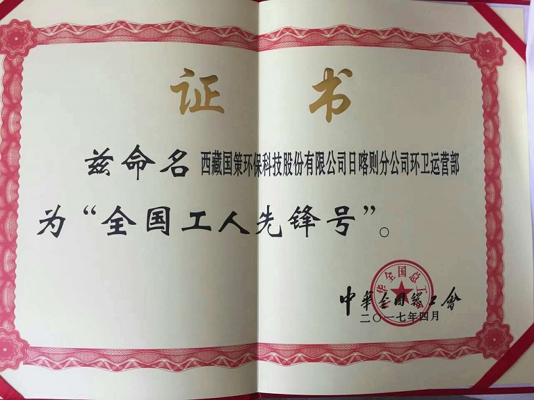 由西藏自治區(qū)推薦,西藏國(guó)策環(huán)保科技股份有限公司下屬日喀則分公司運(yùn)營(yíng)部部榮獲“2017年全國(guó)工人先鋒號(hào)”稱號(hào)。