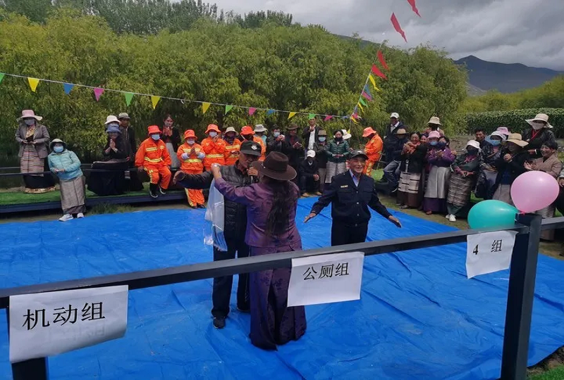 熱情洋溢的歌舞、考驗團結(jié)的拔河比賽、充滿濃烈民族色彩的抱石頭、翻桶比賽......平時樸素的環(huán)衛(wèi)工作者們紛紛脫下了沉悶的工作服,穿上了華美的藏袍,伴隨著精彩的活動,大家或是跳舞唱歌,嘻嘻鬧鬧;或是三五成群,談笑風(fēng)生,整場活動高潮迭起、笑聲不斷。