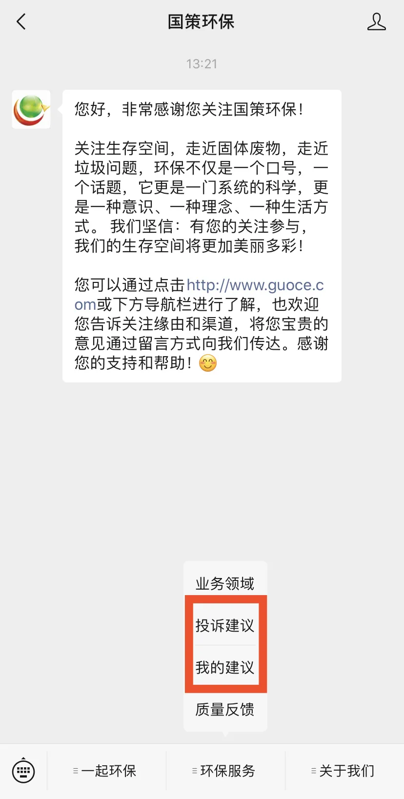 同時,社會公眾可通過關(guān)注國策環(huán)保微信公眾號,對國策環(huán)保運營項目的環(huán)衛(wèi)質(zhì)量和服務(wù)水平提出意見和建議,對保潔不到位、清運不及時的路段或點位拍照上傳,反饋到云平臺,國策環(huán)保將根據(jù)處理進度,推送處理結(jié)果,達到社會共治的創(chuàng)舉。