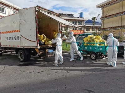 (國策環(huán)保林芝分公司工作人員清運醫(yī)療廢物)