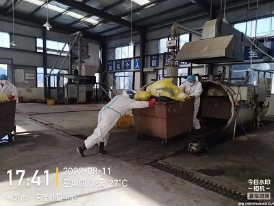 (國策環(huán)保林芝分公司工作人員對醫(yī)療廢物進行安全處置)